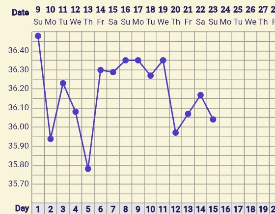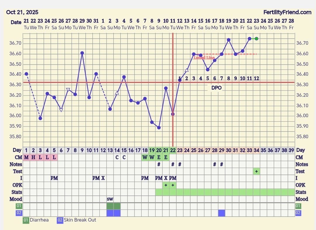 mä oon vähä ristiriitasissa fiiliksissä oviksen suhteen. ff näytti eilen sen kolmion tossa lämmönnousun kohdalla. mulla on useesti kierroissa kolme ekaa päivää oviksen jälkeen melko matalia, joten hyväl tuurilla vois huomenna vahvistaa👀 limat loppu ainakin. testit ei ollu kauheen tummia, mutta mulla ei koskaan tummu ja/tai huippu niin nopee et harvoin oon saanu kiinni. tai sit on viivat vaan kkm jäljiltä edelleen. mutta jänskiä päiviä!