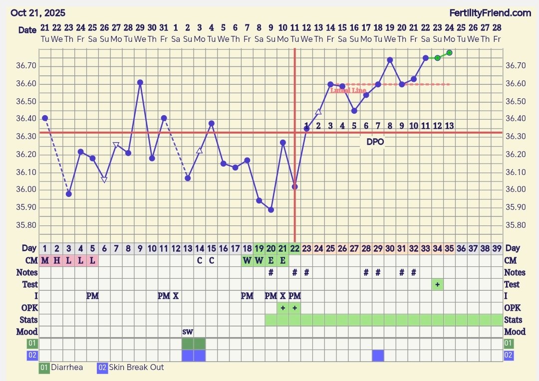Jotain hassua nyt tapahtuu. Lämmöt ei lähteny nousuun, aika tasaset vielä. Olin jo luovuttanu oviksen suhteen ja asennoitunu menkkoihin kun tein toissapäivänä haaleen viivan ovistestillä. No tänään sit vielä ja aika tummaa näytti:Smiling Face With Open Mouth And Cold Sweat: En tiiä onko ihan posi vielä, mutta varmaan aika lähellä. Jotenkin nyt ei enää usko et ois kkm hailuroita, tein herkän raskaustestinki vielä tänään ja se oli kyllä tosi rehellinen nega.