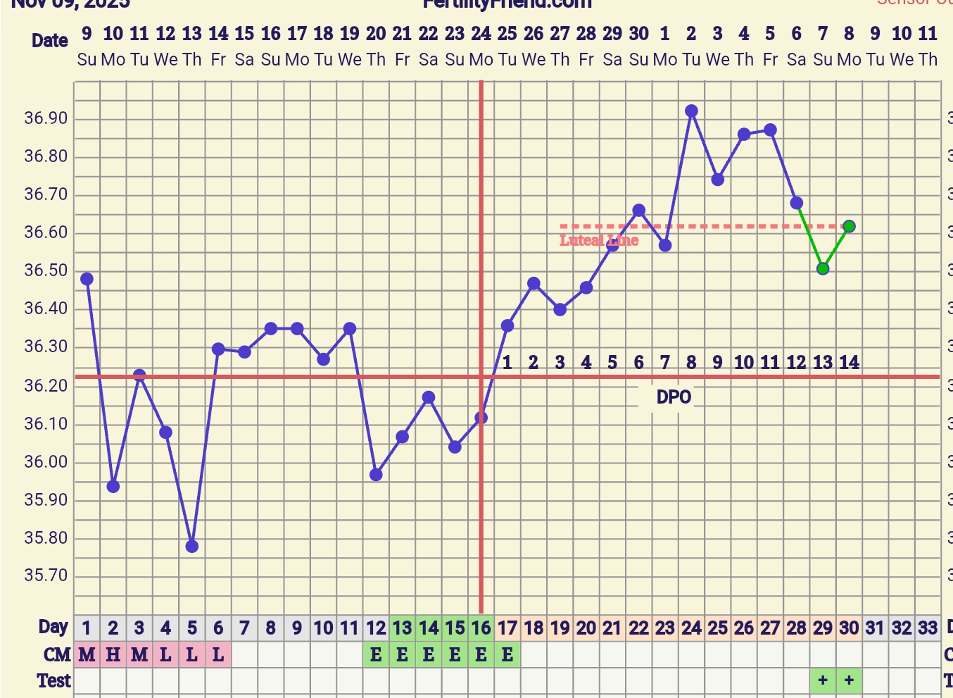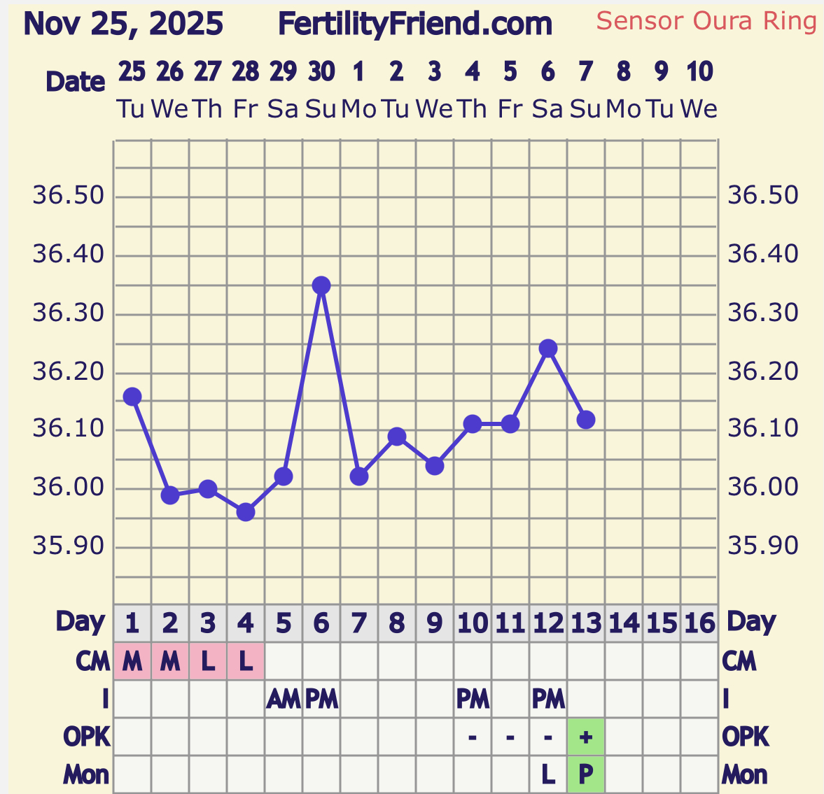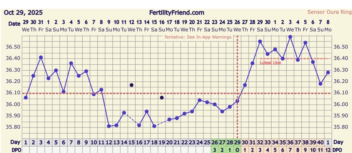 Täällä ollut vähän raskaita päiviä yrittämisen suhteen, tunteet pinnassa ja raskauden kaipuu jotain hurjaa. Käyrältä erottuu ehkä secondary estrogen surge, turvotusta ja usein mulla hormonivaihteluihin liittyvää suolistoperäistä vatsakipua/etovuutta ollut viime päivinä. Toivon ettei arvio ovispäivästä muuttuisi, koska silloin ei loppuviikon kisaväsymys ehtisi niin paljoa vaikuttamaan...
