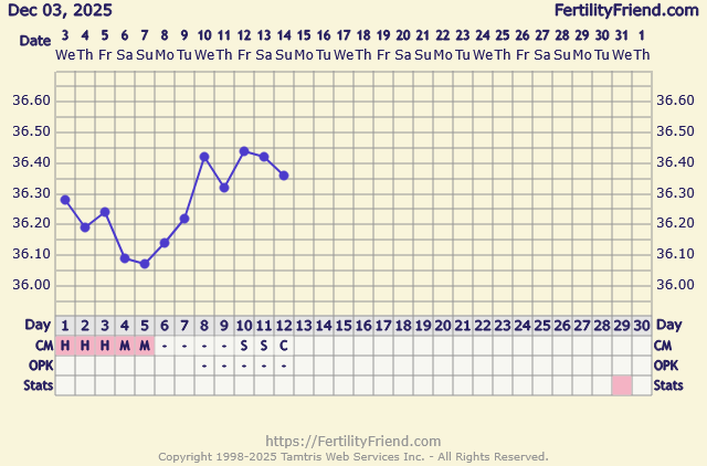 Keskiviikko iltana selvät ovulaatio kivut, ke-to yönä selvä lämmönlasku ja seuraavana yönä nousu normi lämpöön, mutta sen jälkeen taas kaksi yötä näyttää pientä lämmön laskua. Ei siis neljään päivään selkeää lämmön nousua.