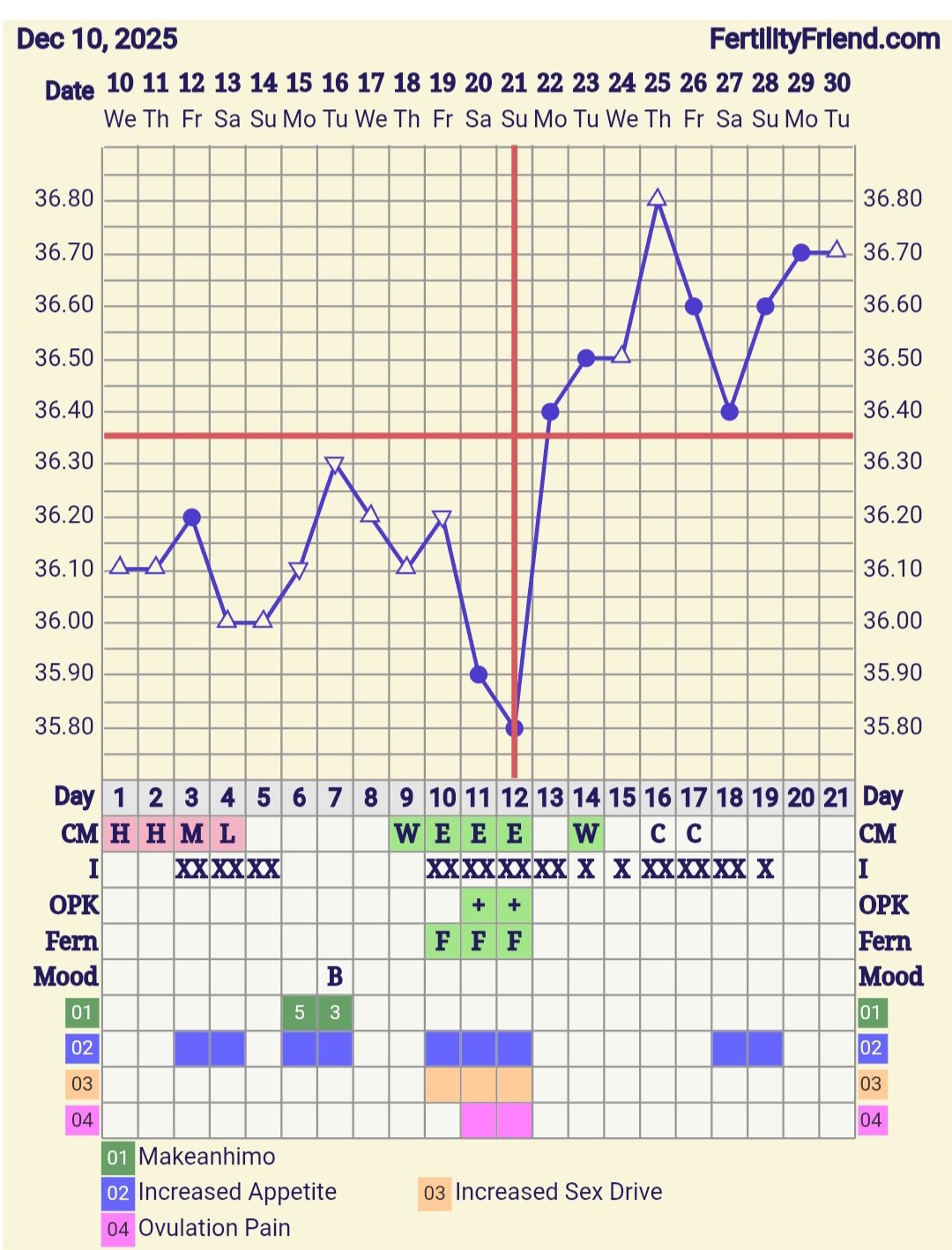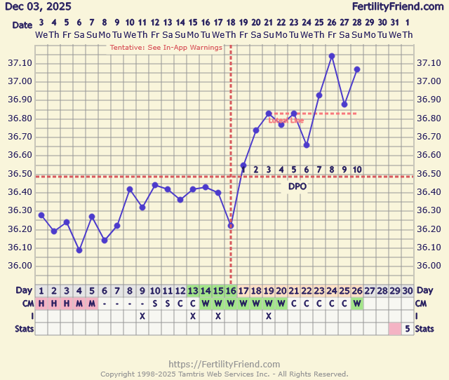Mulla lämmöt jatkoi toista päivää nousua taas vaihteeksi ja nousi täysin samaan lukemaan kuin aiemmat korkeimmat lämmöt. 😬 Siitä innostuneena tein vikan herkän apteekin testin heti samalla kerralla kun kävin vessassa, mutta ehkä korkeintaan viivanpaikka. Jollainen kyllä eilenkin vain parin tunnin pidätyksellä tuli, kun tein tyhmänä eilenkin testin. Ja kun jo dpo11 tänään, ainakin käyrän mukaan alkaa toivo aikalailla olla menetetty... 🙃 Joten eiköhän se vuoto "kivasti" ala juuri uudenvuoden aattona, "hyvä" päätös paskalle vuodelle... 🥴