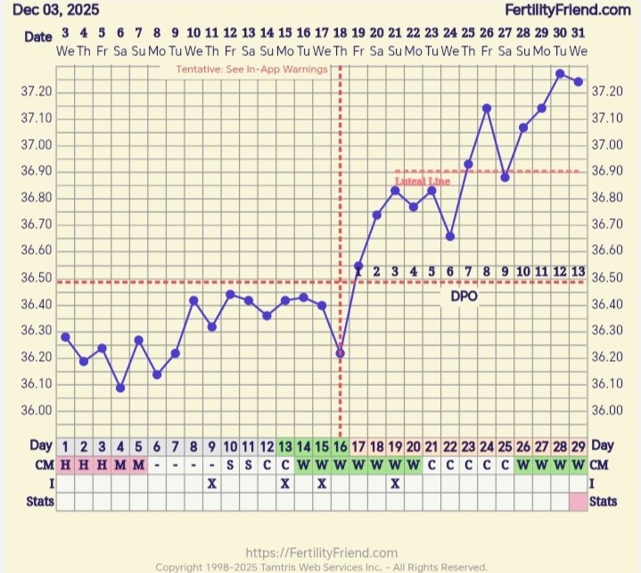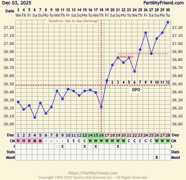 Mun mielestä tuossa on selkeä triphasic-käyrä! Tuliko siitä jonkinlainen ilmoitus?Nyt muuten löysi ff triphasic kuvion mun käyrästä.Dpo9 kohdalta löysi sen? En kyllä ihan ymmärrä mitä se käytännössä tarkoittaa?? Ja se pregnancy monitor kohdassa kun ne pisteet aikaisiin raskauden merkkeihin, monta päivää oli 20 pistettä nyt on tänään 70. Sinänsä eihän tuo nyt mitään tarkoita että varmasti raskaana, lähinnä mielenkiintoista, kun en viimeksi tuota kohtaa löytänyt edes...