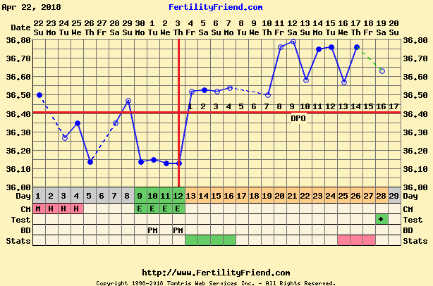 Juu, ei tarvinnutkaan sitten tänään testailla. Sen verran selkeä lämmön pudotus ja tiputtelu lisääntynyt, että tästä päivästä tulee kyllä vielä kp 1. Tänään ei harmita enää niin paljon kuin eilen ja kyllähän mä tiesin, että noin alhaisilla rautavarastoilla raskautuminen on epätodennäköistä.