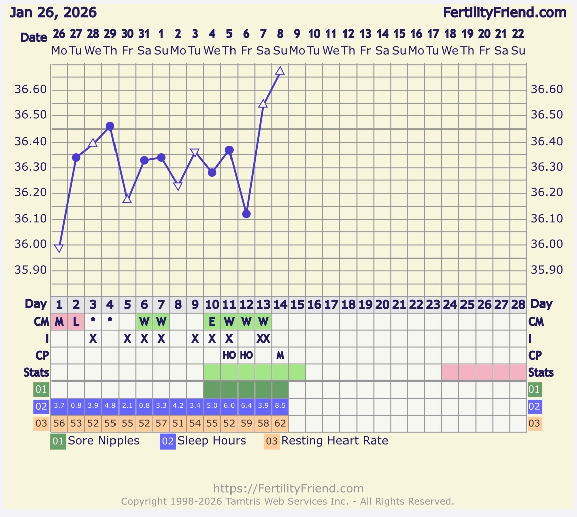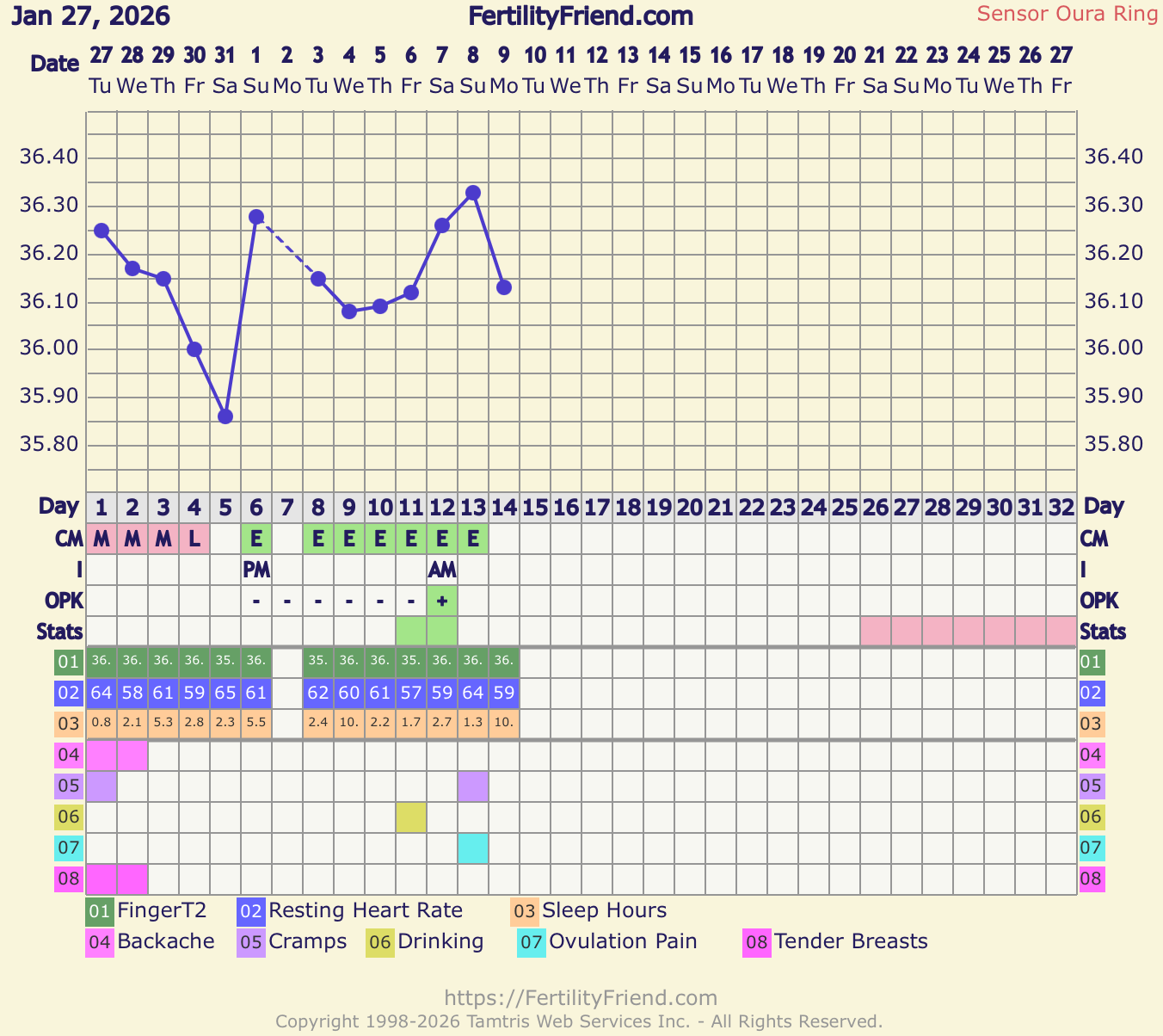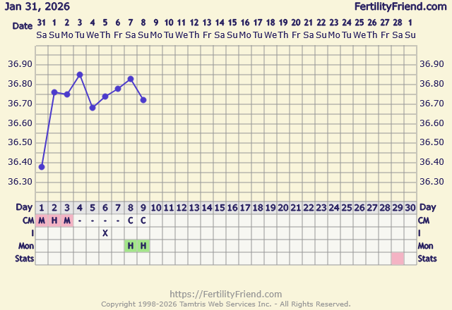 Ja joo nyt on kp9. Uusi kierto alkoi 31.1. Odotan että ovulaatio viimeistään perjantaille osuu ensi viikolle....