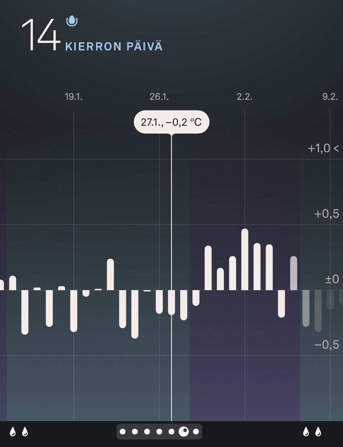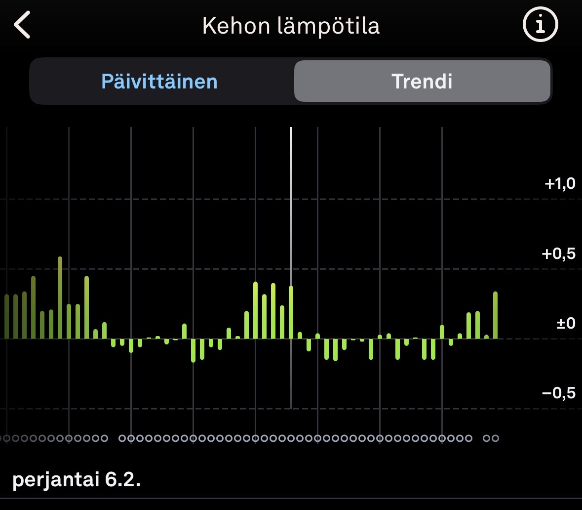Seurailen nyt lämpöjä ff:ssä mittarilla, mutta mielenkiinnosta katselen ouran lämpöjä sen omassa sovelluksessa. Näkyy nyt tämä bbt-mittarin tasaisuus verrattuna ouraan.
