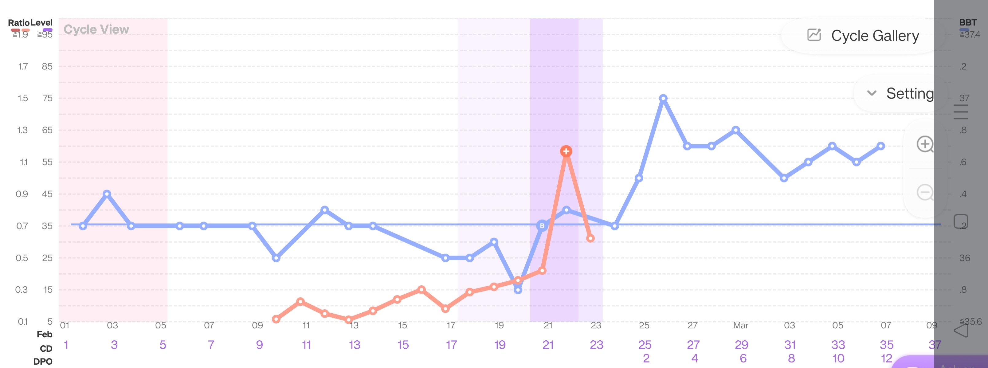 Vähän nihkeesti nousee, mutta koko ajan suunta ylöspäin! Merkkaiskohan ff oviksen huomenna? 🤔 Ourakin tajusi nousta pykälän ylöspäin, mutta sen ovisveikkaus on yhä huomiselle. Merkkaan ouraan sen positiivisen ovistestin vähän viiveellä, sillä haluan nähdä mihin se nyt tuon laittaa itsekseen.