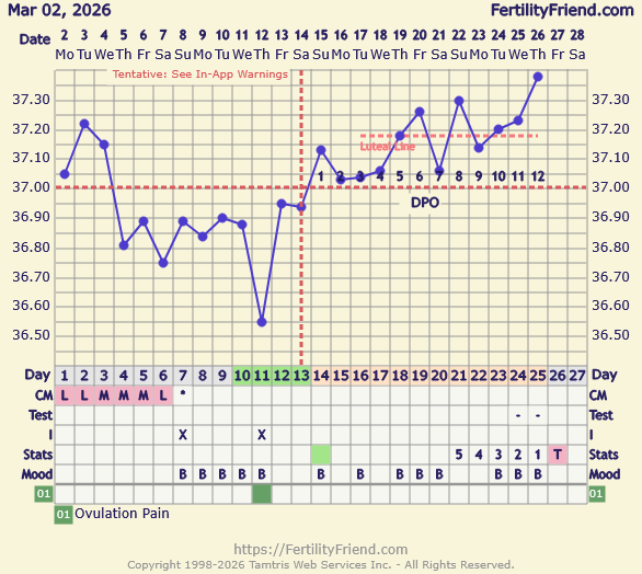 Mä nyt laitan tämän mun uuden fertility friendin dpo tulkinnan pelkkien lämpöjen perusteella ihan vaan muuten vaan. Taisin mainita että poistin toissa päivänä ne lima merkinnät ja pelkkien lämpöjen perusteella ff tulkitsi että dpo 2 päivää myöhemmin, että olisi siis nyt dpo12 eikä dpo14. Taidan kyllä tästä lähtien vaan jättää ne limojen tulkinnat pois kokonaan ja antaa ff:n päätellä milloin ovulaatio pelkkien lämpöjen perusteella ihan suosiolla. 😳 No joo oli sitten dpo14 tai dpo12 eiköhän se nega lopullinen tuomio ole... Toisaalta heräsin tasan 8 ja lämmöt noin korkealla niin on se vähän erikoista? 🤔 Ottaen huomioon että jo oli sitten se dpo12 tai dpo14...