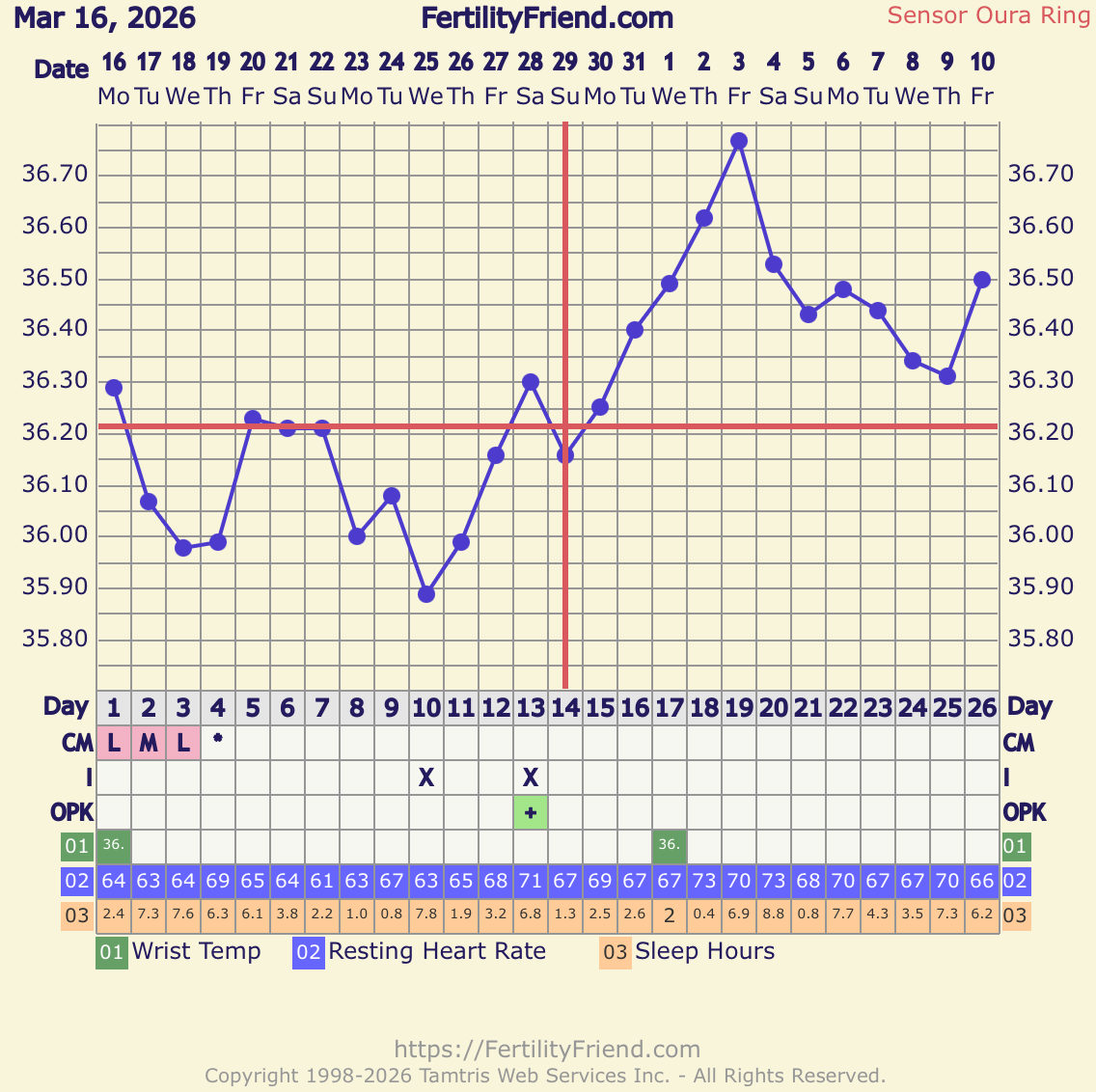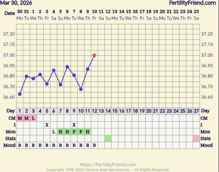 Mulla tuli tuo punainen neliö niin oletan huomenna ja ylihuomenna jos lämmöt nousee niin tänään on dpo1 todennäköisesti. Tai vähän pelkään tuo pudotus lämmöissä kp10 niin voi olla dpo2 ff:n mukaan, mutta ennemmin luulen että dpo1 kuitenkin. Kumminkin kp10 näytti vielä huippu lukemaa se clearbluen laite niin en usko että sinä päivänä ovulaatio on voinut olla.