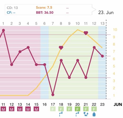 Jes, hienoa ettei eri olosuhteet paljoa vaikuttaneet lämpöihin :)Täällä saatiin ihan ok tasoisia lämpöjä mökkireissullakin (max 36.4, alkukierron lämmöt) ja ovista odotellaan :) tänään kp11 ja sen suuntaisia limoja ollut jo.