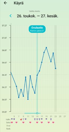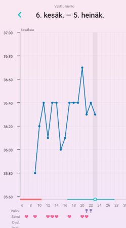 Eiköhän se sieltä sitten oo pian tulossa kun oireitakin siihen suuntaan onTäällä sahailee lämmöt tämmöstä käyrää, ei tainnu olla vielä ovis siis. Oireita kyllä on että niillä main varmaan liikutaan. Tänään/huomenna tallettelua lisää niin kyllä se siitä.![]()