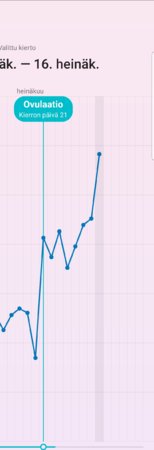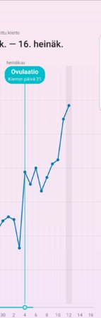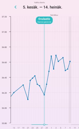 Teillä näyttää hyvältä! Oma käyrä nyt huviksi tänne, vaikka toivo menetetty. Tuo yksi korkea, en tiedä mistä johtuu, ehkä kahdesta lasista viiniä edellisenä iltana?? Tai mistä vaan olosuhteista. Sama tämän aamun alhainen, olosuhteet? Taas pari tuntia myöhemmin oli perus 36,61. Kyllä ne menkat alkaa viimeistään ke:bag: enkä ehkä edes pääse inssiin ensi kierrossa :( pskaaa