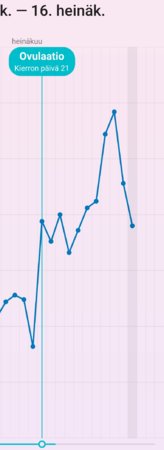 Mulla ponnahtaa aina kerralla ylös, tai tähän asti on käynyt niin... eli ei ole tasaista nousua vaan keskimäärin 36,4 -> 36,8 suoraan. Missäs kohti se ovulaatio tapahtuu, jos nousee pikkuhiljaa? Ennen ensimmäistä nousupäivää vai jonakin niistä? o_O