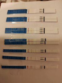 Mulla näyttää dpo9-dpo15 tältä. Viime päivistä vahvistumista on vaikea havaita, kun ainakin kuivuttuaan näyttää kaikki aika samalta. 😅