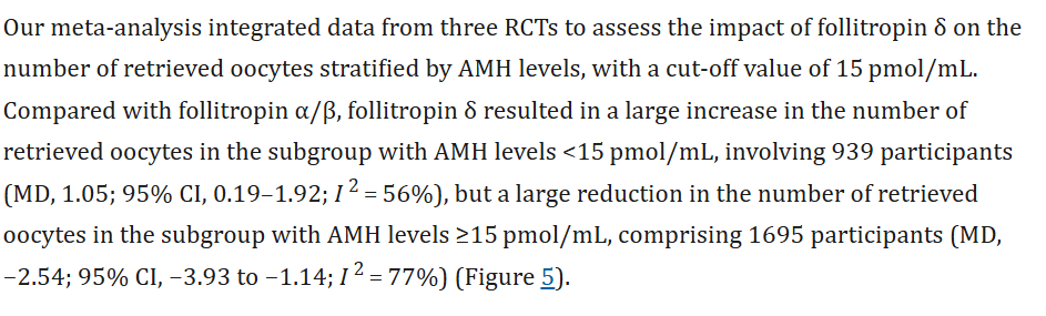 Nopeasti tuota selailtuani vaikuttaisi, että matalammalla AMH:lla on saatu parempia tuloksia follitropiini deltalla vs. follotropiini alfa/beeta: