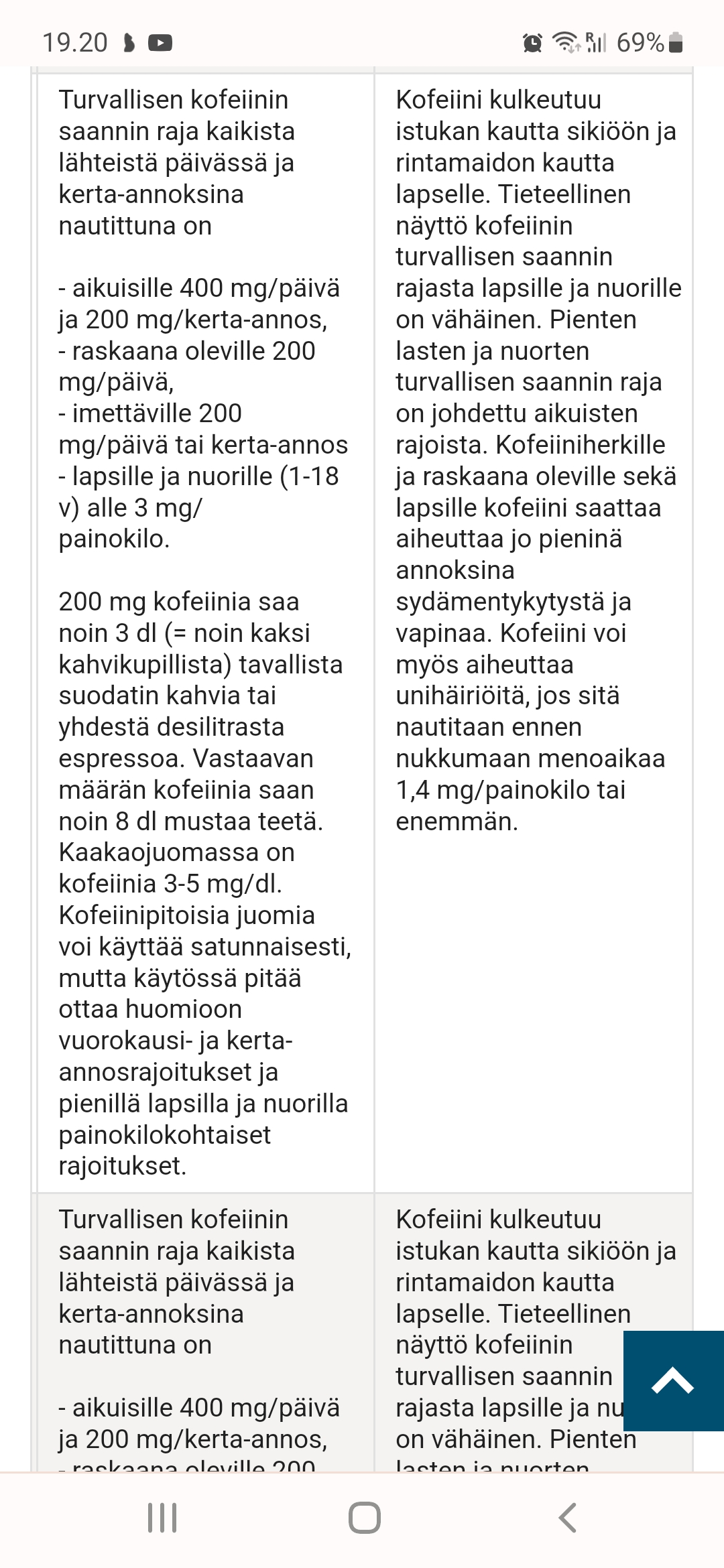Sen mukaan turvallista kofeiinin vrk annosta ei raskausajalle ole. Noi tutkimukset on hankala toteuttaa kun samaa lasta ei voi tutkia kofeiinia saaneensa ja ilman saantia.