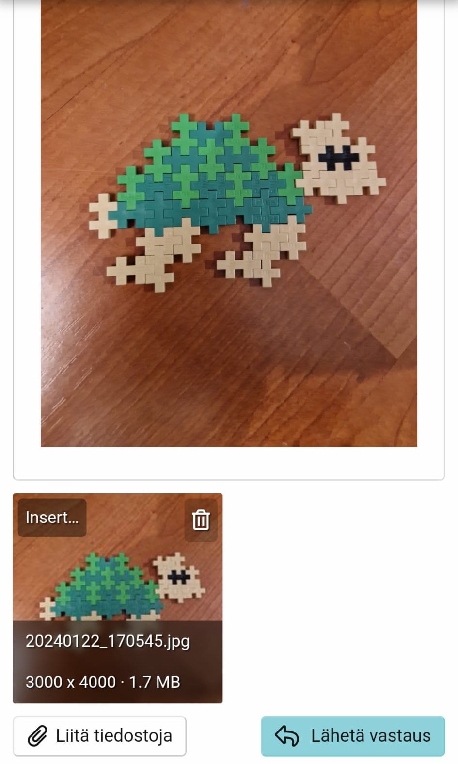5. Jos haluat pienemmän kuvakkeen, poista automaattisesti viestiin näkyviin tullut kuva askelpalauttimella. (Siis samalla tavalla kuin poistat kirjoitusta.) Viestin alle tulee jokaiselle kuvallesi lisäyspainike, josta sen saa lisättyä viestiin. Klikkaa/napauta painikkeesta "Insert..." tekstiä.