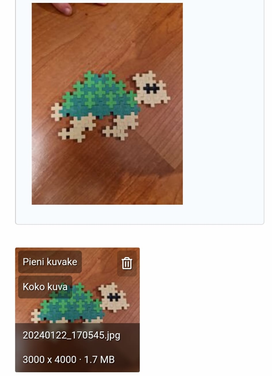 6. Pääset valitsemaan haluatko pienen kuvakkeen vai koko kuvan. Valitse pieni kuvake, jos haluat sen. Saat myös koko kuvan taas näkyviin viestiin, jos olet vahingossa poistanut sen. Alapuolisessa esimerkkikuvassa on pieni kuvake, yläpuolisessa taas koko iso kuva.