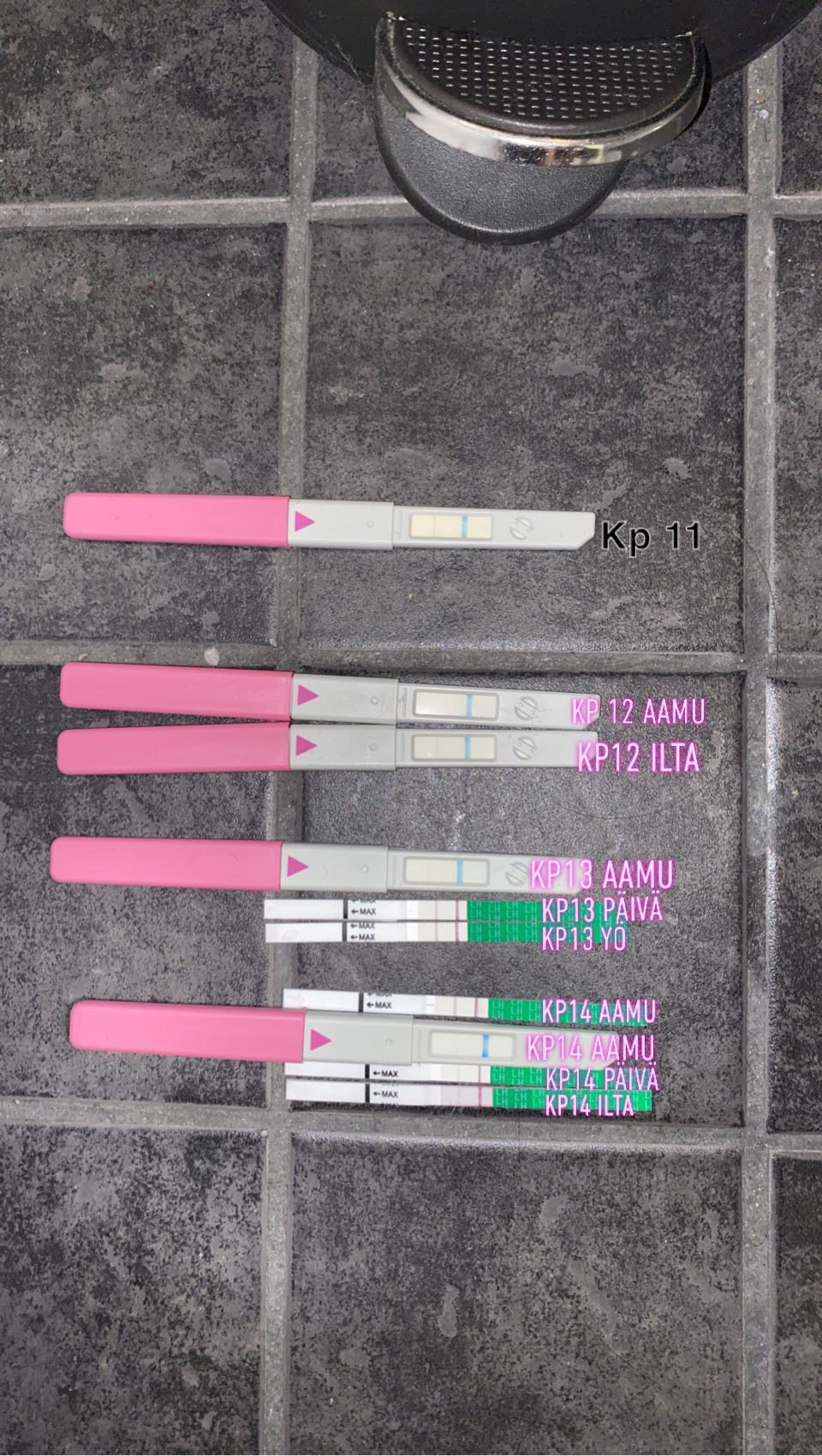 Asiaan, aamutestit on koko yön pidätyksellä otettuja, päivä testit vähintää 4h pidätyksellä. Tuo kp 13 yötesti on otettu vain 2h pidätyksellä. Mietin, että onko mahollista että silloin olisi ovis tapahtunut? Se on omaan silmin tummin vaikkei plussa olekaan ja sen jälkeen on testit alkanut haalenemaan. Tänä aamuna kp15 testi oli samanlainen kuin eilinen kp14 iltatesti.