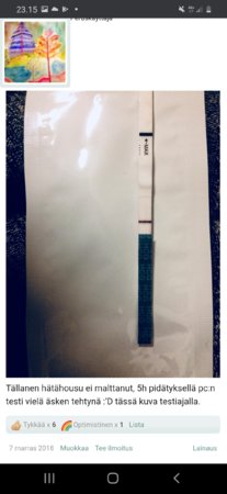 Tuon testin onneksi voi tehdä mihin vuorokauden aikaan tahansa lukee ohjeessa. Joten taidan tuhlata vielä yhden tänään. Meni meinaan koko testinotto sähläykseksi kun en saamut rauhassa tehdä sitä(yövieraana oma äiti) ja kastoin sitä liian vähän aikaakin...en 10s kuten ohjeessa.