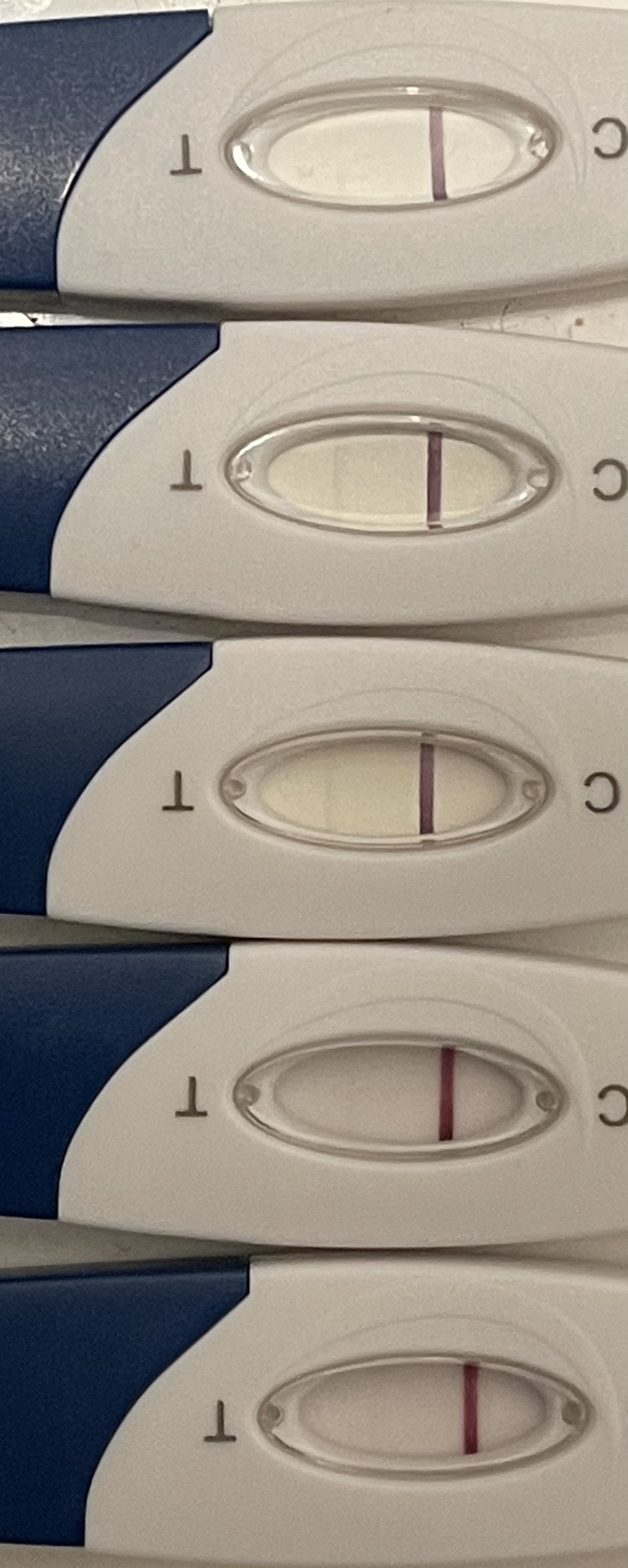 ylhäältä alas: dpo 10 ilta, dpo 11 ilta, dpo 12 aamu (toinen pissa), dpo 13 päivä, dpo 13 päivä, dpo 13 ilta ja alin tänään dpo 14 aamu (toinen pissa). Tässä siis yhteensä viiden päivän kehitys ke-su, jotenkin luihulta tuntuu…
