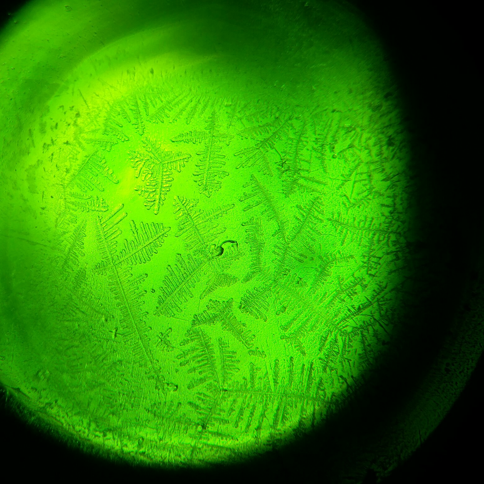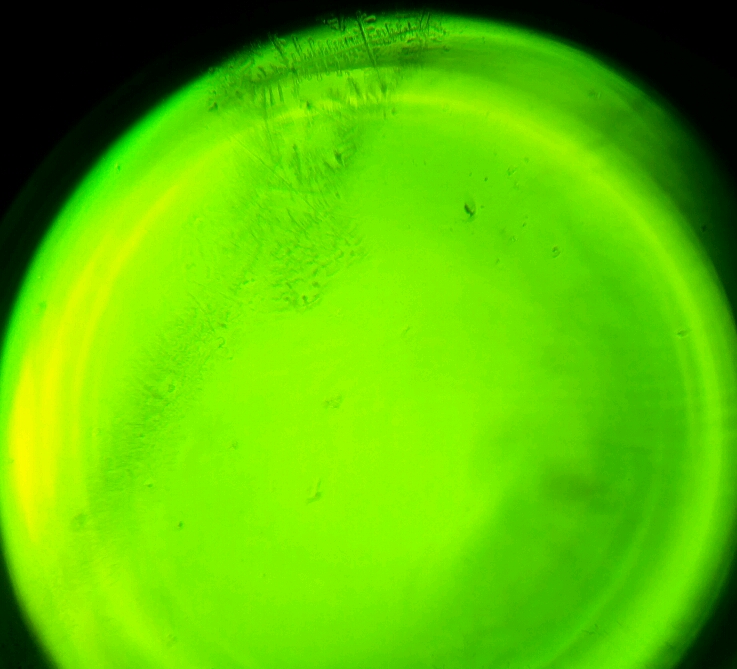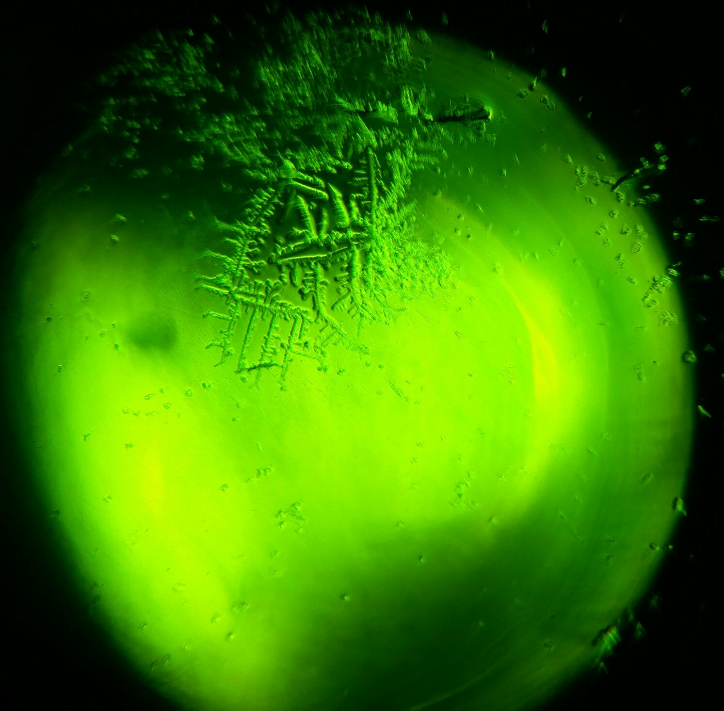 Voisko se johtua jotenkin kuivumisesta? Et reunat on kuivunu eka ja kuivuessaan "neste on vetäytyny kohti keskustaa" jättäen solut kuivalle. Ja keskellä näyte on sitten ollut paksumpi ja kiteytyminen on päässyt tapahtumaan :s