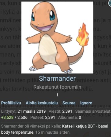 On hän foorumilla, mutta ei ole kirjoittanut 10 päivään. 15 minuuttia sitten katseli jotain ketjua. Toivottavasti kaikki on hyvin.Huomasiko joku muu, että kaikki Sharmanderin viestit olis kadonnu?Onkohan hänellä