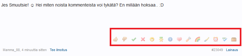 Mamma_88 Tietokoneella tuosta (kuva alla) ja sovelluksessa kun kosketat kommenttia niin yläoikeella pitäis näkyä kolme neliöö joista löytyy tykkääminen.