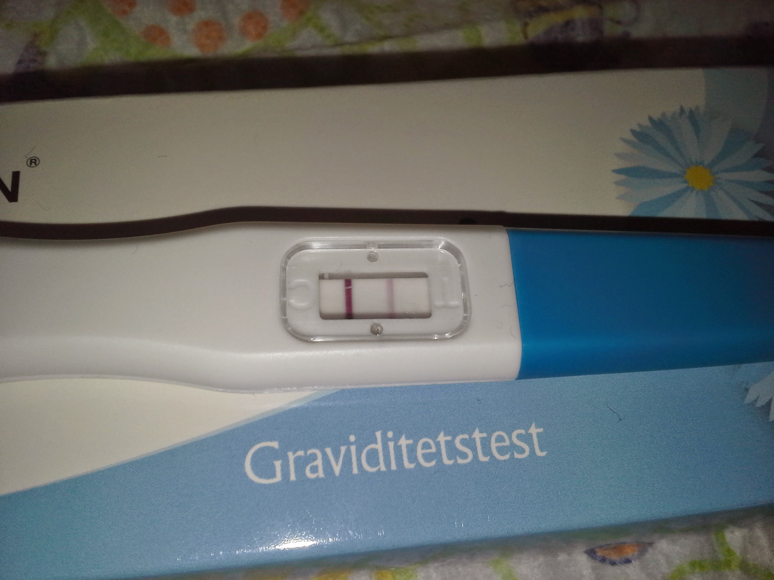 Torstai-iltana tuli se varsinainen oire, mikä on aina ollut merkinnyt, et raskaana ollaan. Minnuu kylmi ihan kauheesti ja tuntu tosiaan ,että on tulossa kippeeksi. Lämpö ol 37.0. Aikasemmin en oo mittaillu lämpöä. Perjantaina kp 32 uskaltauduin tekemään testin. Minuutin sisällä siihen piti tulla se toinen viiva, mut en uskaltanut läheltä kattoo, ni näin vaan sen kontrolliviivan. Laitoin kännykkään lisä-aikaa 4 min ku 5 min sisällä testi näyttäisi oikein. Kun olin laittanut ajan juoksemaan, katoin tikkua ja ihmeekseni näin ku näinkin toisen viivan, mutta viiva oli kyllä haalea!