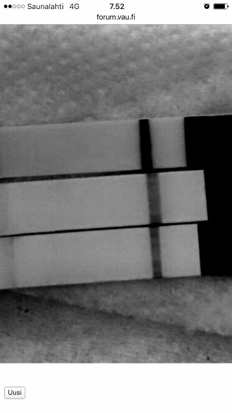 Pakko oli itsekin testata tänään :laughing002 10mlU/ml testillä testasin mutta aikalailla puhdas nega, EHKÄ jotain olematonta viivan alkua näkyi tai sitten oli mielen tuotetta. Kuvaan en saanut kaapattua. Mutta eipä se mitään kun tänään dpo 8, lauantaina sitten uusiksi! :p