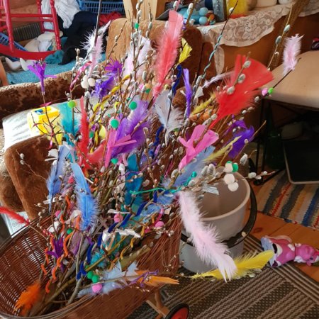 Me saavuttiin pääsiäisen viettoon ep:lle. Koristelin lapsia varten oksat yksin, kun ei niiden kärsivällisyys riittänyt :grin Mut se oli mukavan terapeuttista :wacky: