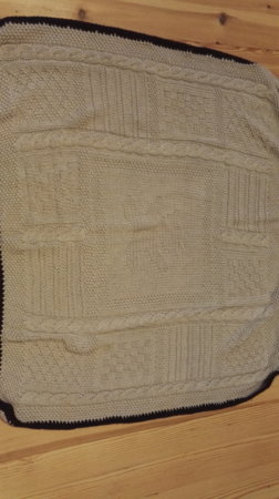 Toivottavasti tästä kuvasta saa selvää. Lanka on sirdarin baby bamboo, kiiltää kevyesti niin tälläi hämärässä jo vaikeampi kuvata. On venynytkin käytössä, niin en saanut ihan suoraksi aseteltua. Tarkoitus on myös kirjoa lapsen nimi ja syntymäaika nallen ympärille, mutta tiettekö ku ei oo tässä 3,5 vuodessa vielä ehtinyt... :rolleyes: