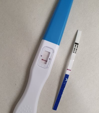 Nyt täytyy lopettaa testit ja oottaa rauhassa, mitä tapahtuu, tämä testien kanssa stressaaminen ei sovi yhtään :facepalm:. Aikaisempi km vaan kummittelee... Äsköisen testausretken tuloksena halppis one step -liuskaan aiempia haaleampi, vain käännettäessä näkyvä haamu ja apteekkarin oma tuo toinen. Mikä mahtava idea oli testata molemmat kerralla, tähän asti testaillut vain noilla halppiksilla..