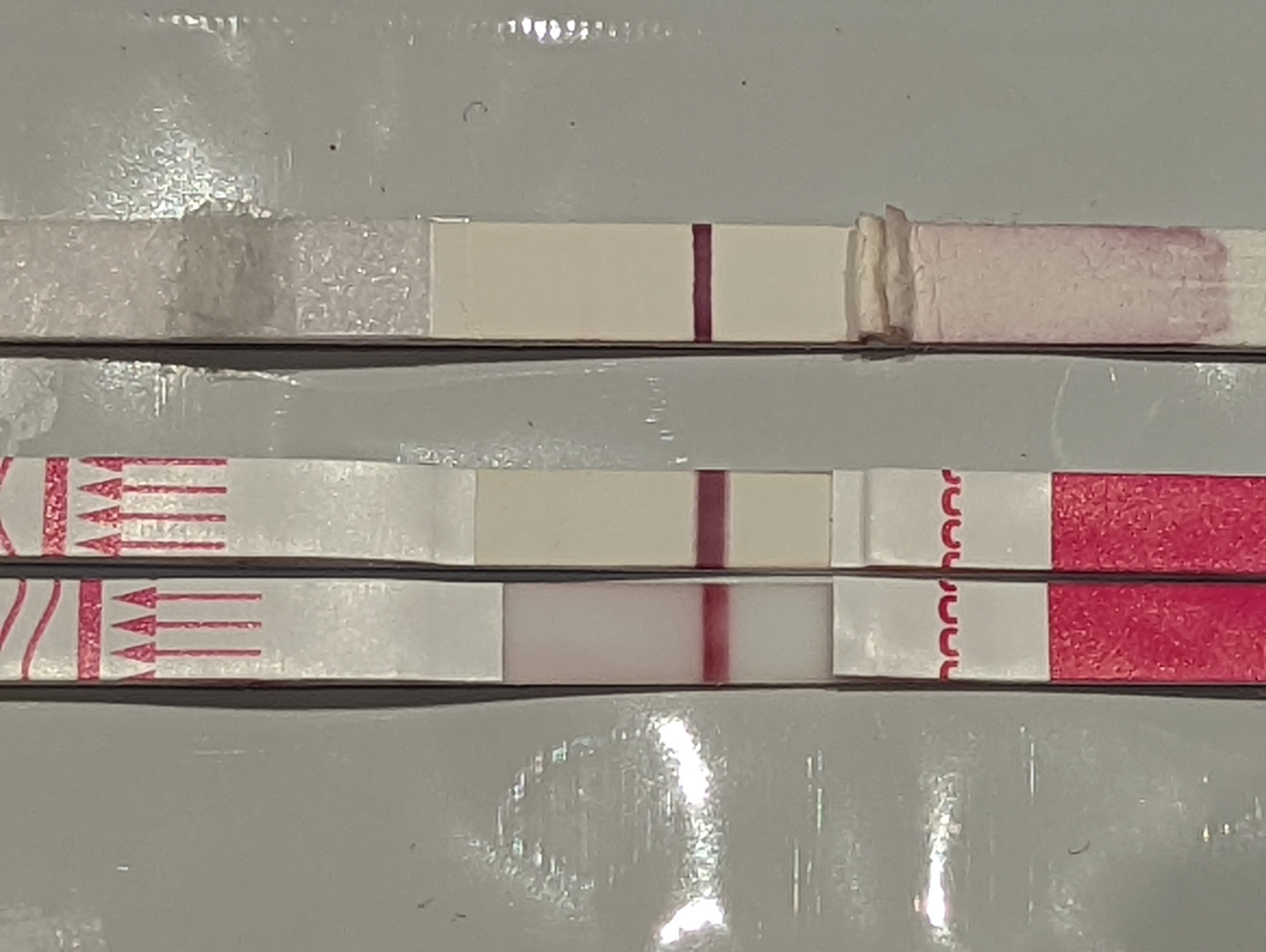 Täs vielä kuva testeistä :) ylimmät kaks on eilen tehtyjä ja kuvahetkellä jo kuivuneita, mut vielä niissä vähän näkyy. Ylin apteekin ultra, alempana sit medigoot. Alin on aamulla tehty ja vielä tuore kuvaa ottaessa.
