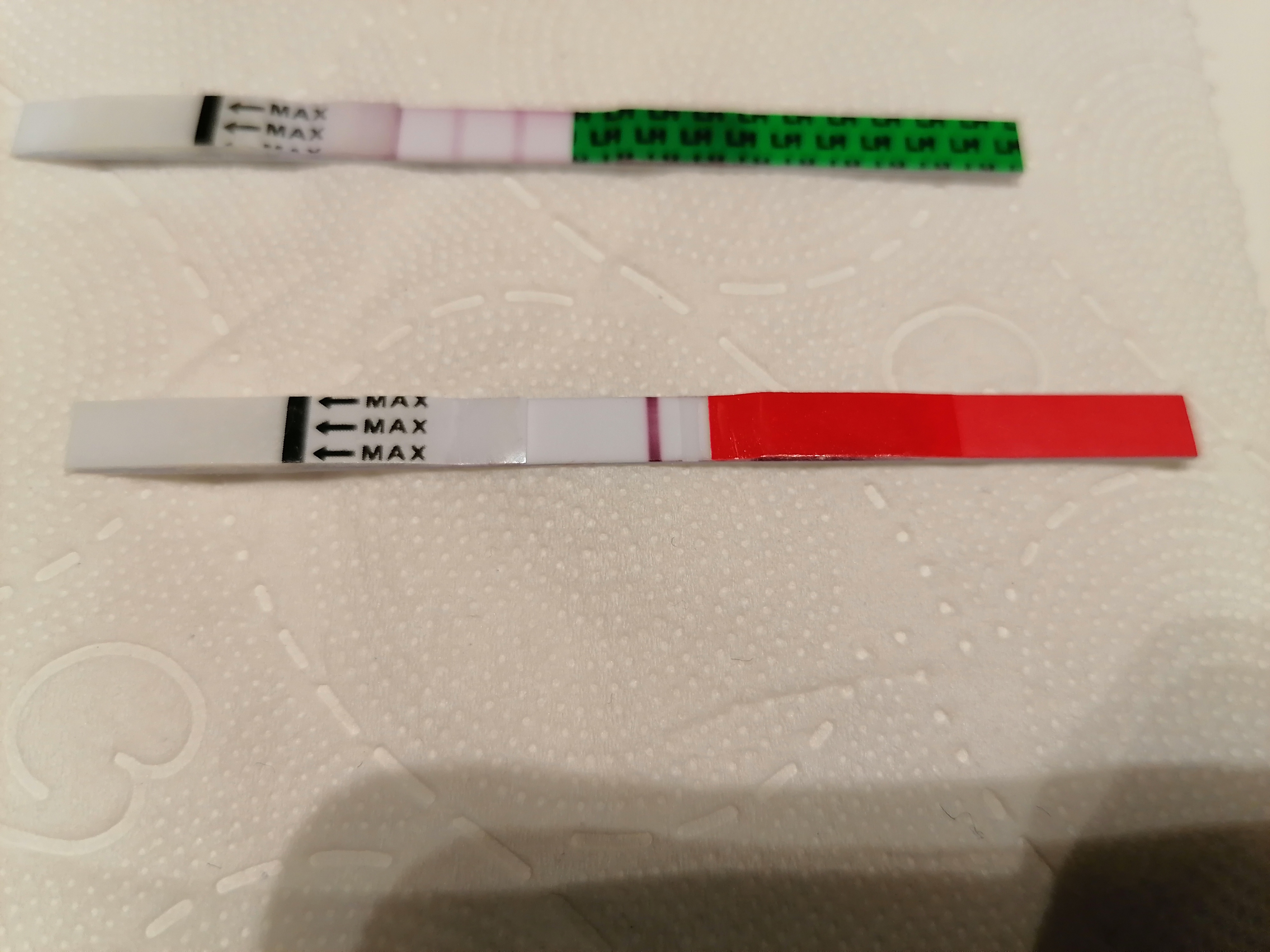 Kyl siinä jotain näkyy! Mulla negakierroissa ollut kyllä kans vastaavia, mutta voihan lähteä tuosta vahvistumaankinApua. Tänään vasta dpo 7 ja tuli jokin pakko testata. Toinen kuvista testiajalla ja toinen kuivuttua. Oonko mä seonnut vai näkyykö nuissa jotain?