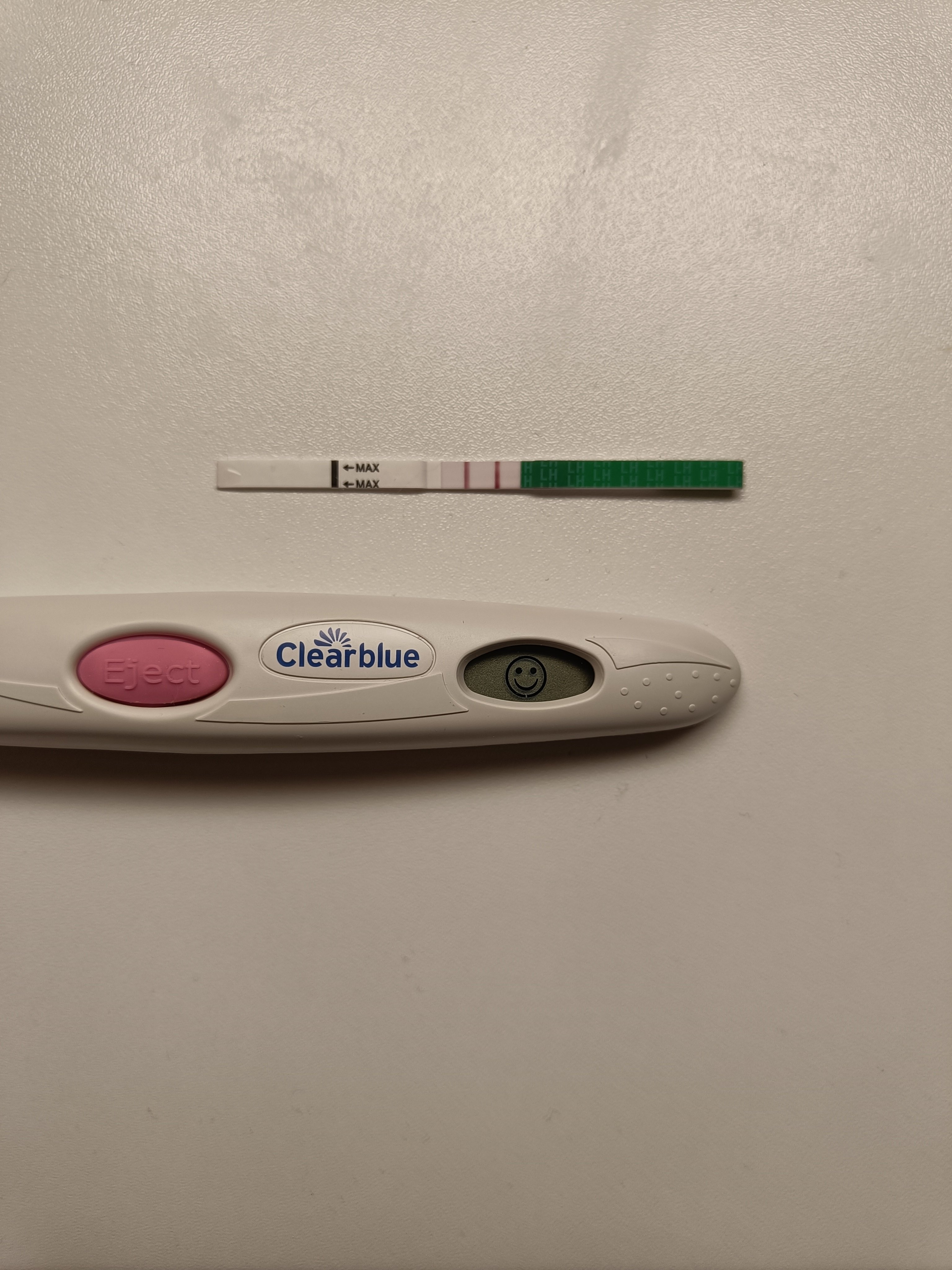 Toissa kierrossa siis tikutin ovista ekaa kertaa elämässäni, niin sattui jotenkin niin hyvä tuuri, että ekana iltana testatessa tuli heti melkein tasavahvuinen viiva, ja heti seuraavana aamuna selvästi vahvempi kuin kontrolliviiva. Eli en päässyt näkemään pitemmältä ajalta sitä omaa kaavaa, missä vaiheessa se viiva lähtee vahvistumaan. Voihan se olla, että mulla on aina tosi lyhyt ja nopea lh-piikki, jota ennen ja jälkeen vain hailakka viiva koko ajan.