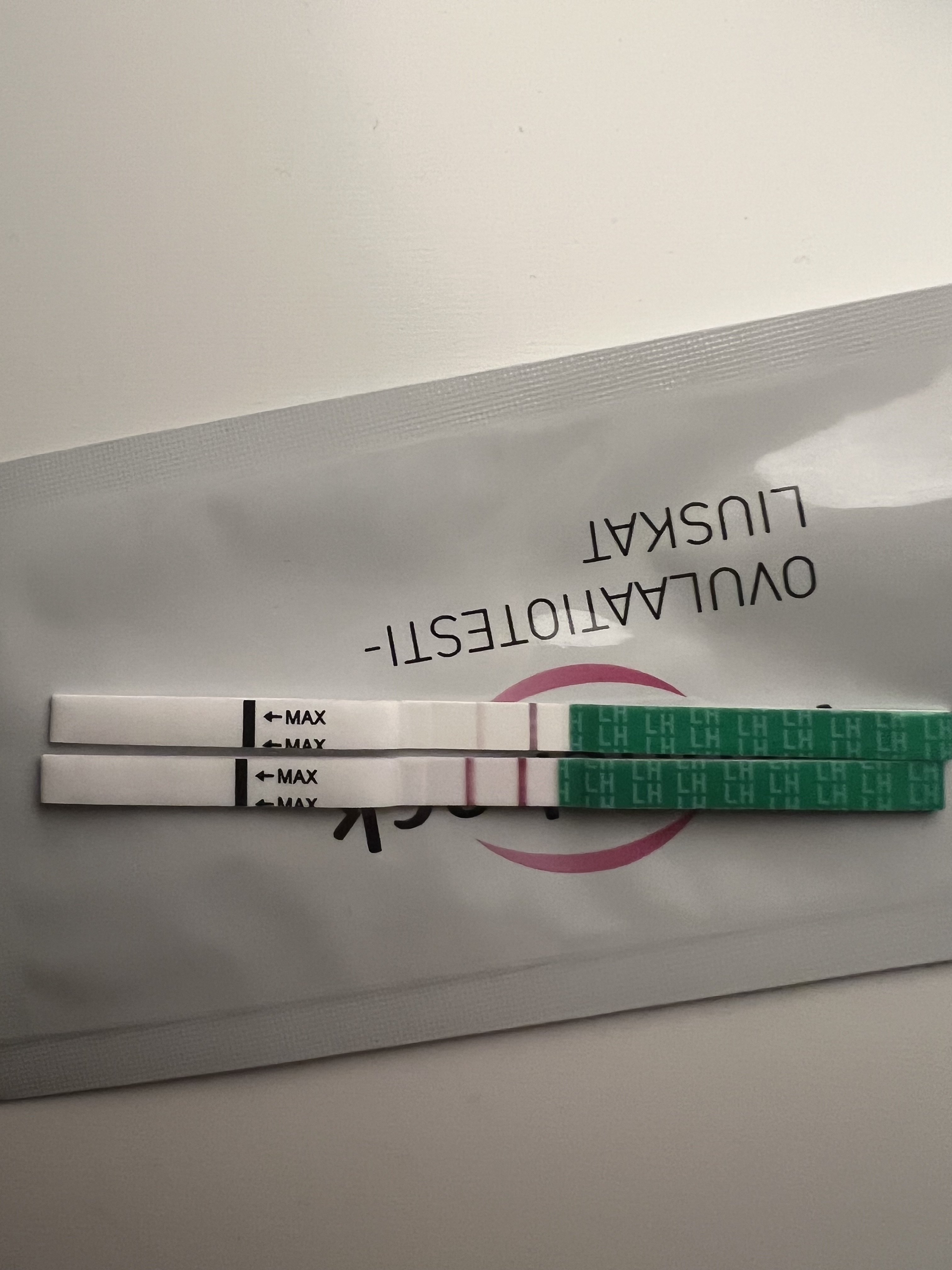 Täällä oireet viittasivat lh:n nousuun, koska illalla tikkutesti selvä pos. (Kuvassa ylempi aamulta, alempi illalta.) Ylpeänä sit menin miehelle testiä näyttämään, ja tiputanssikin tuotti vielä tulosta🐥🐥 Kivaa kun nyt kärryillä päivistä🙂