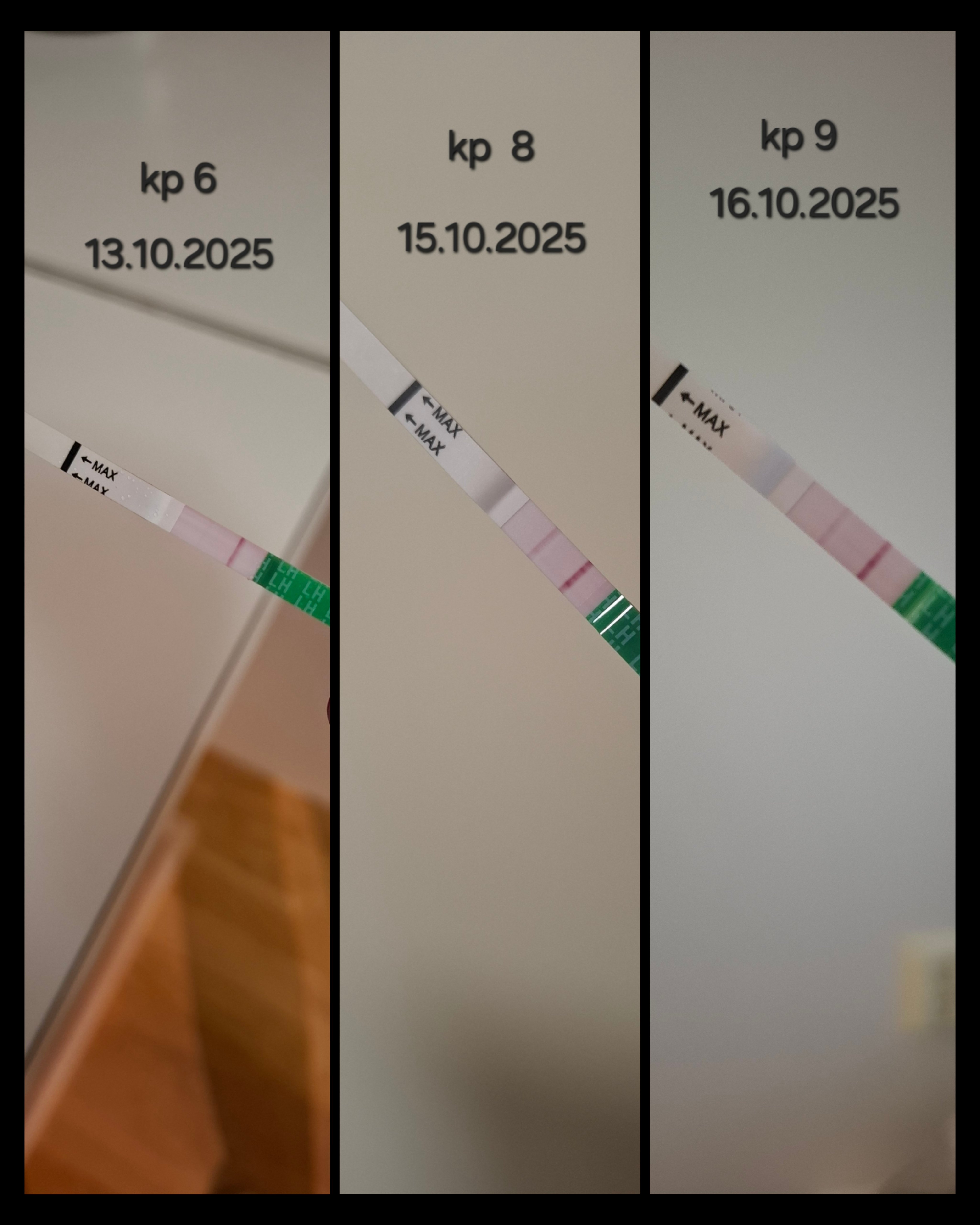 Nyt ostin Pregcheckin ovulaatioliuskoja ja vaikka laskennallisesti ovulaation pitäisi olla vasta vajaan viikon päästä 22.10, niin ovulaatiotestin mukaan 13.10 kp 6 aamulla oli selkeä nega, 15.10 kp 8 aamupäivällä testiviiva oli erittäin selkeästi näkyvissä, mutta ei kuitenkaan vielä yhtä vahva kuin kontrolliviiva ja tänään 16.10 kp 9 aamupäivällä oli jo paljon haaleampi kuin edellispäivänä. Mietinkin että onkohan LH-huippu voinut olla siinä välissä. Oireita on ollut limaisuus ja menkkamaiset kivut.