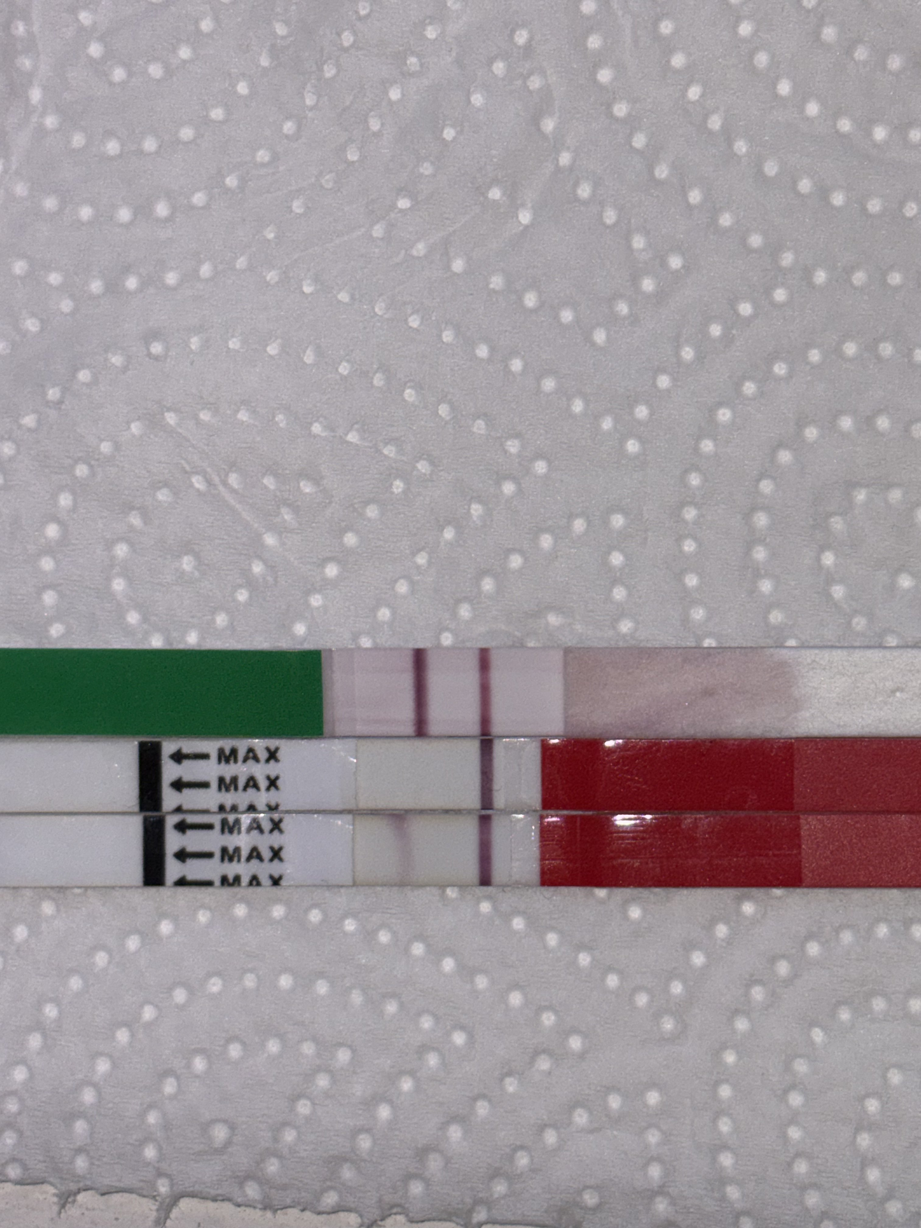 Tota mäkin oon kuullut, mitä @Kali sanoo, että jos testit on märkinä vierekkäin, niin tulos ei ole luotettava. Mutta ainakin mun silmä erottaa tuosta keskimmäisestäkin testistä haamuviivaa. Patjat kannattaa tampata tänään ja huomenna sekä mahdollisesti ylihuomenna, siitä ei ole haittaa. Suosittelen kuitenkin tekemään vielä jonkin eri merkin testin vaikka ylihuomenna (siis raskaustestin). Voihan olla, että sun ovulaatio on ollut aiemmin kuin luulit, koska muutenhan sulla oli dippiä lämmöissä ja muitakin mahdollisesti alkuraskauden oireita (vaikka ne onkin tosi yksi yhteen pms-oireiden kanssa 🥴) @Kyfi3922260