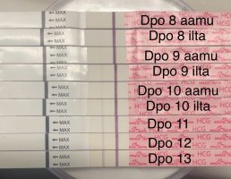 Mä oon testaillut ku hullu ekasta plussasta asti, jonka sain dpo 11 torstaina. Nyt siis dpo 14 ja pikkuhiljaa ne sieltä vahvistuu 😊 1000157007.jpg